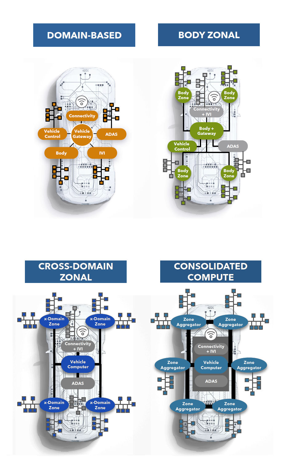 These four network organizations appear in Figure 1 below. The cross-domain zonal and consolidated compute network architectures shown in Figure 1 have a central vehicle computer at their core, which would operate an autonomous vehicle.