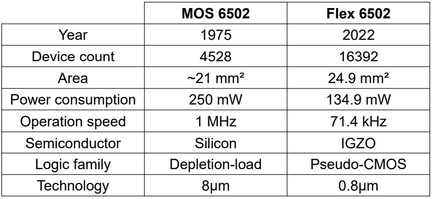 To cut a long story short, the resulting Flex6502 demonstrates excellent characteristics for IoT applications, including high speed (71.4kHz max operating speed), low power consumption (11.6mW when running at 10kHz, 134.9mW when running at the max operating speed), and high transistor integration density (~16,000 transistors with 0.8µm gate length in a 24.9mm2 chip).