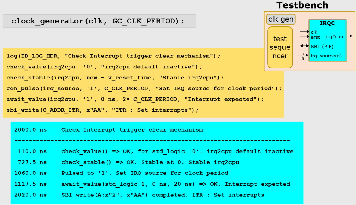The UVVM Utility Library contains a bunch of functions and procedures that can be used to build a testbench to exercise this IRQC module. We start with a clock generator, which can be instantiated by calling a procedure from the Utility Library (the statement in the gray box). Next, we create the test sequencer, which consists of a set of procedure calls (the statements in the orange box). When the test sequence is run, the results are shown in the transcript log (the blue box). (Note that this is a simplified transcript—it’s also possible to set/display prefixes, message IDs, and scope.)