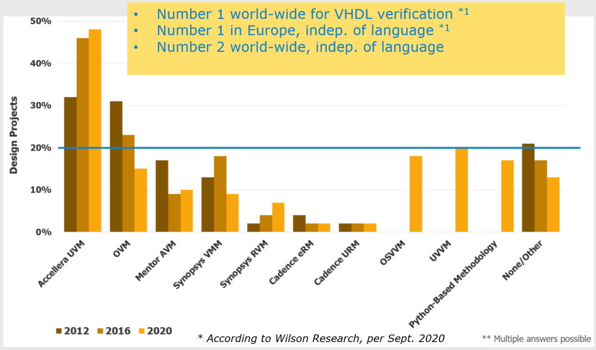 Mentor Graphics (now Siemens EDA) uses a company called Wilson Research to perform a survey once every two years on ASIC/SoC and FPGA development. The folks at Wilson Research look at lots of different aspects, like how many people are using the various languages and the categories of bugs they are finding. One of the things they look at is how many people are using the various verification systems.  In the 2020 survey, UVVM came out on top for VHDL verification methodologies.