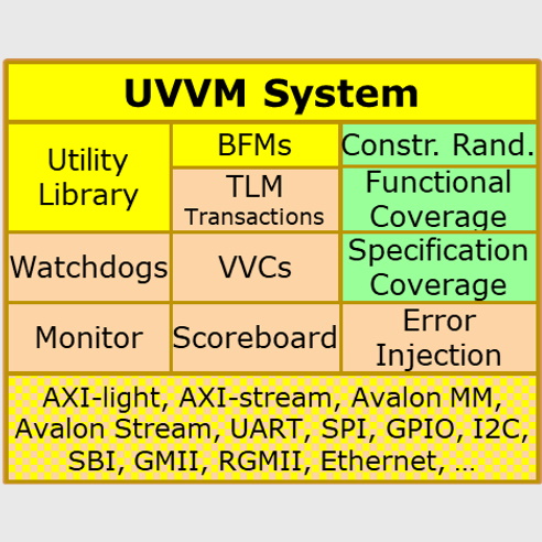 Remember that this is just an example of the entry level to UVVM. Next, we have a cornucopia of bus functional models (BFMs) accompanied by a plethora of supported interfaces (AXI-light, AXI-stream, Avalon MM, Avalon Stream, UART, SPI, GPIO, I2C, SBI, GMII, RGMII, Ethernet…). These are also open source and free.