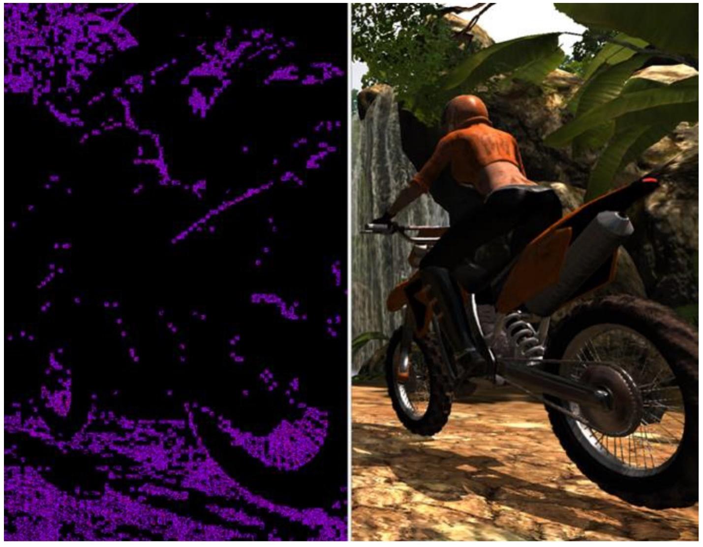 The decision happens on a block-by-block basis, not over the whole image, so some portions of a video frame may get compressed one way and some the other. In fact, that’s nearly always the case. The image on the left shows how a typical patchwork of 16×4 blocks have passed through the lossless pipeline (in black) versus the lossy pipeline (in purple) to produce the final image on the right.