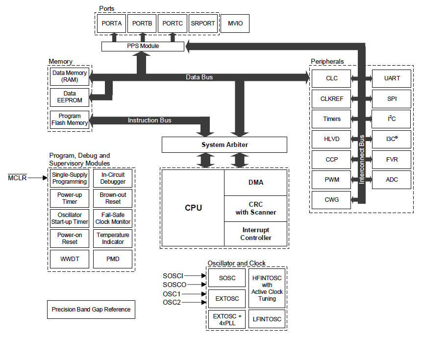 Block diagram of a Microchip PIC18-Q20 MCU. Image credit: MicrochipÂ