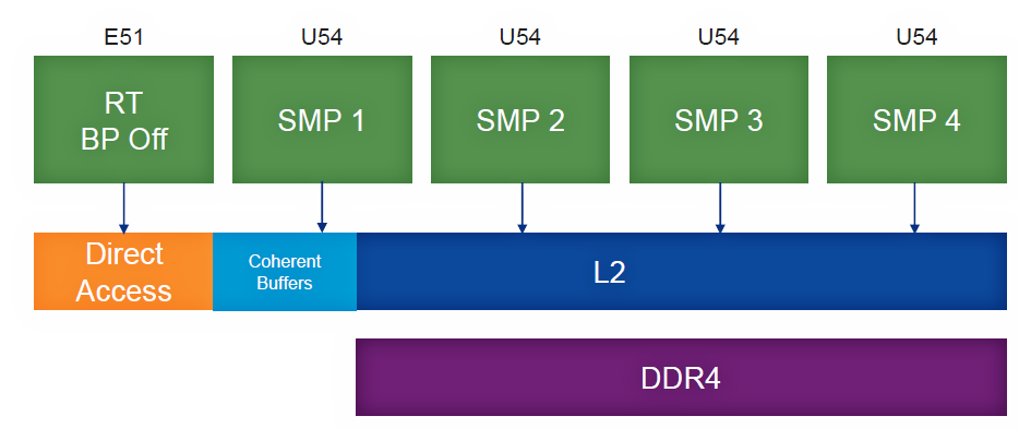 The PolarFire SoC’s five 64-bit processor cores all communicate through a common, 2Mbyte L2 cache with some unusual properties that earn it the name “Deterministic L2 Memory Subsystem.” The L2 memory is partitioned into eight chunks, and seven of the chunks can be designated as cache, as a coherent scratchpad buffer, or as direct-access memory as shown in Figure 2. This L2 flexibility enables many real-time configurations for the processors.