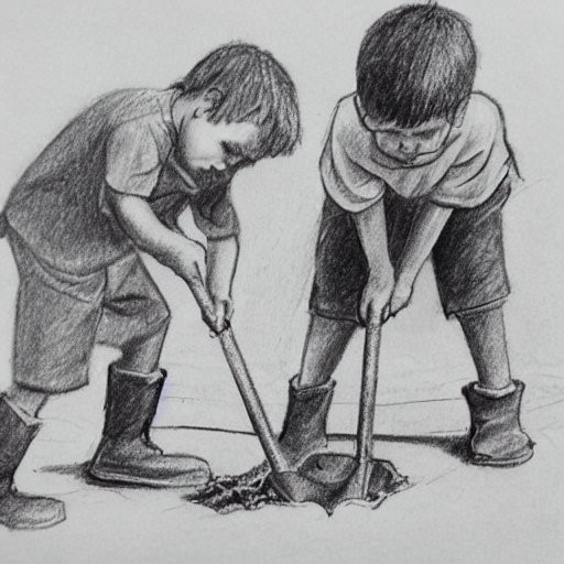 Having said this, on a whim, I just went to Stable Diffusion Online, which offers a free Stable Diffusion artwork generator with no login required and a license to use the generated images as you see fit (so long as you don’t do so for nefarious purposes or break any laws). In the Prompt field I entered something like “Pencil sketch of two small boys in boots and shorts digging a hole in a garden with shovels.” The following is what it came up with: