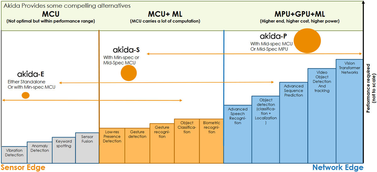 The applications shown as orange in the diagram cannot be implemented using MCUs by themselves; instead, they require some level of ML acceleration. These tasks can be easily accomplished using an Akida-S accompanied by a min-spec or mid-spec MCU.