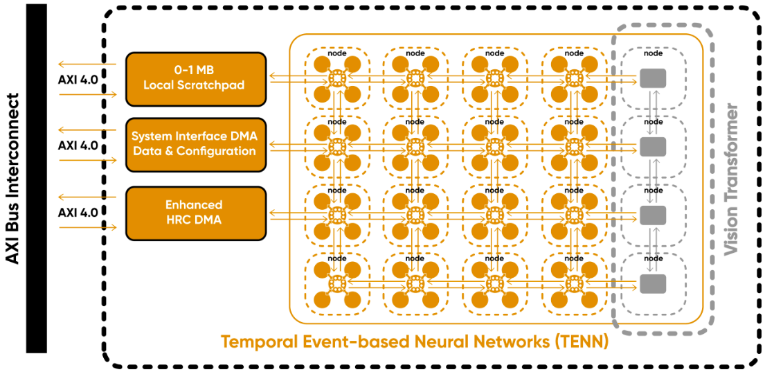 Everything inside the dotted line is the IP that developers will integrate into their system-on-chip (SoC) devices. Communication with the rest of the SoC is realized via standard AXI bus interconnect. In addition to the temporal event-based neural nets (TENNs) and vision transformers, we have a local scratch pad memory, a system interface DMA, and an enhanced high resolution coding (HRC) DMA. This fully digital event-based design, which is portable across different foundries, accelerates all types of networks, including CNNs, DNNs, vision transformers, native SNN, and sequence prediction.