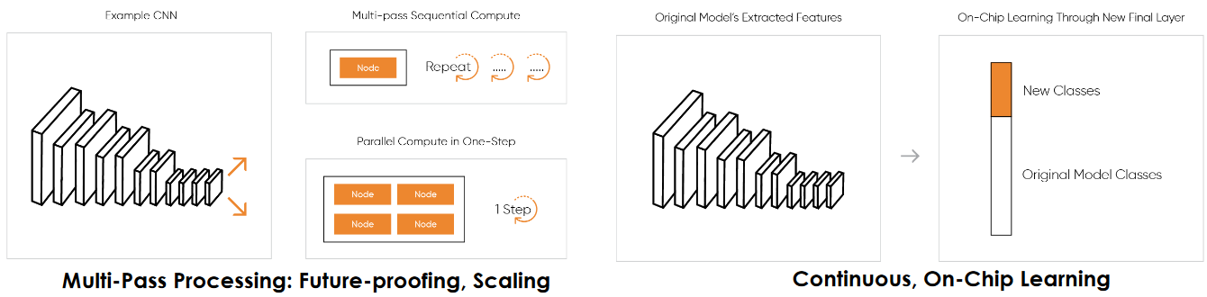 One distinguishing characteristic of the Akida is its ability to support multi-pass processing, which means developers can implement more complex networks on smaller die areas. For example, suppose you have a complex and parallel network that would ideally be served by four Akida nodes. Now suppose you don’t have space budgeted on the die for this, in which case you could use a single node and perform multiple passes.