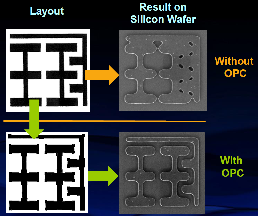 Let’s start with OPC. For anyone new to the notion, we’re at silicon feature dimensions far too small to be printed by 193-nm light. And so we play tricks to get it to work. The problem is that features are so close to each other that they interfere with the fidelity of each other’s shapes. So the shapes are modified – or “assist features” are added – to fool the light into doing what we actually want. This is OPC.