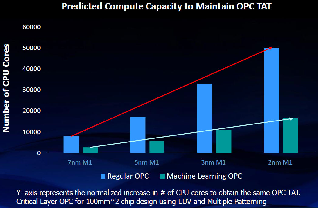 They’ve targeted the first two for help using AI. (The window-enhancement notion is something we’ll talk about more in the future.) The issue is that, in order to achieve the needed accuracy, the number of cores required to complete OPC within 24 hours is increasing dramatically. They see AI as a way to bring this down.