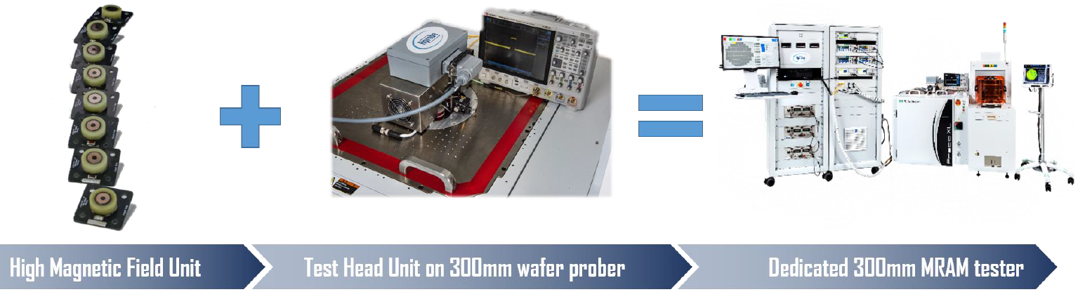 HProbe has built a test head that can apply and sweep a magnetic field quickly enough for production. In fact, they’re now on their second generation, suitable for production of smaller-geometry magnetic tunneling junctions (MTJs). The first-generation device could apply a field of up to a half-Tesla in any direction. The second generation can sweep up to 2 T perpendicular to the die.