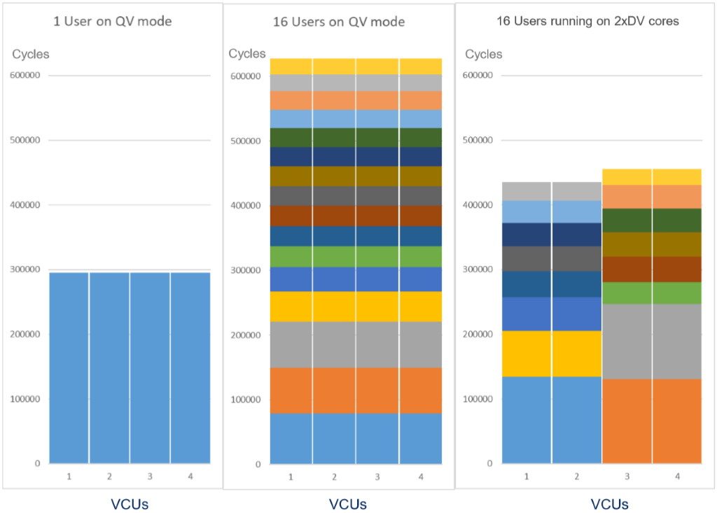 The example above shows the case of a 5G NR 4×4 channel estimation task. We start with a single user running in QV mode (left). With 16 users running in QV mode (center), control overhead doubles the overall cycle load relative to single user allocation (in single thread mode). By comparison, significant improvement is seen for the multi-user case when the CEVA-XC16 switches to a dual-thread mode running on 2xDV cores.