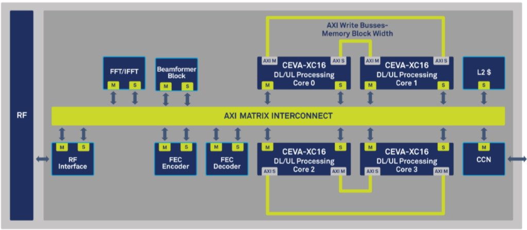Observe that, in addition to the four CEVA-XC16 cores having access to the main AXI matrix interconnect, they also have their own AXI master/slave back-channels for inter-core communication. The result is that just one such cluster can process 4 x 100 MHz TDD carriers, 128 x 8 MIMO, and 256 QAM with a 125 us subframe, and all with a 35% reduction in silicon footprint as compared to equivalent previous CEVA-XC-based clusters.