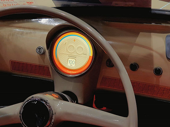 The electrified Fiat 100 has a modern, digital HMI fitted into the circular space previously occupied by the mechanical speedometer.