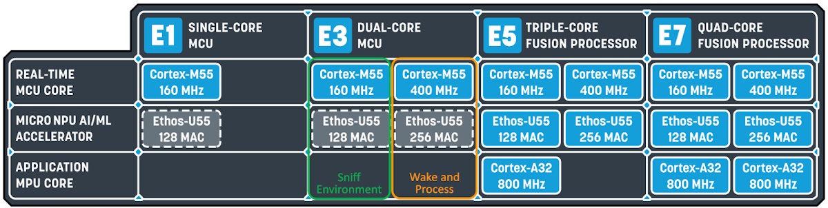 The easiest way to wrap our brains around this family is to start with the image below. The Ethos-U55 is a micro neural processing unit (microNPU), which is optional in the E1 and E3 devices.