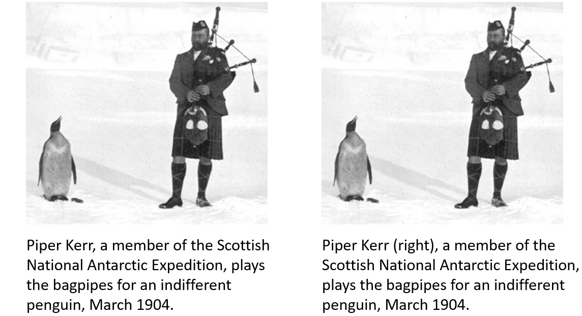 Did I really need to add the “(left)” qualifier to the Ensemble MCU in the image above. Well, do you recall the classic jape someone played in respect to the Scottish National Antarctic Expedition of 1902-1904 as presented in the Wikipedia? One of the images in that article is of a Scottish guy playing the bagpipes. The original caption was as shown on the left below.