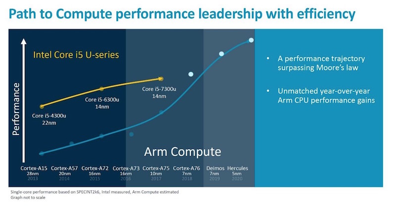 First of all, the horizontal axis – the one that actually is labeled – is misleading. When the chart places Deimos in 2019, that’s the date of first IP release. Same goes for Hercules in 2020. It takes another year or two before those IP releases get turned into silicon, and another year or more before they’re in any consumer products. In contrast, the Intel dates are solid ship dates. Intel’s Core i5-7300u – the newest and fastest part on ARM’s graph – has been shipping since 1Q 2017, which was more than 18 months ago. In contrast, there are still no consumer products based on Cortex-A75, which is shown immediately below it in the same timeframe. Kaby Lake is shown in 14nm silicon, versus ARM’s assumption of 10nm for Cortex-A75, 7nm for Deimos, and 5nm for Hercules. They’re comparing apples and orangutans. Shift those lines by about two years and you’ll be closer to the truth.