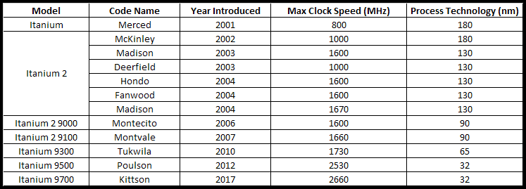 I take no glee in reporting the continued and agonizingly slow demise of the Itanium processor. Despite all of the criticism, it was a very noble project. If you look at the number of Itanium processors developed (see table below) and multiply it by the number of person-hours you need to develop one microprocessor chip, the resources expended on the Itanium project as a whole staggers the mind.