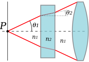 The NA has to do with the widest angle from which light can be collected (in the case of a microscope) or dispersed (in our case). In the image below, you can see that any light going from the first medium on the left to the second at an angle greater than θ1 will miss the second lens, so that makes it look like a function of the setup. But even if you have an infinite second lens, there’s still a limit: if you go too wide, you end up with photons skipping off the surface of that first element (n2) like so many smooth, flat rocks hopping across a river.