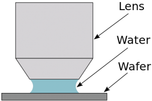 Normally, that last distance the light travels is simply the air between the light source and the wafer. But replacing that air with liquid, you end up with a different NA – and a larger one. That’s the whole idea of “immersion”: the light path is immersed in liquid up until it hits the wafer. That liquid could be a lot of different things; at present, it’s purified water. So even with 193-nm light, you can now resolve smaller features than was possible before.