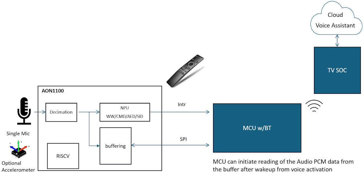 The second mode is of use for things like TV controllers, smartwatches, and headsets that already contain an application processor (AP). In this case, the AON chip communicates through standard interfaces allowing the AP to configure it. Then the AP goes to sleep, leaving the AON chip to monitor what’s happening. The AON chip only wakes the AP when required.