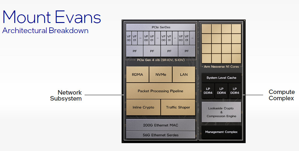 Intel’s second announced IPU proves that IPUs need not be based on FPGAs and suggests that IPUs need not even be board-level products. Intel calls the Mount Evans ASIC an “IPU on a chip,” developed in partnership with an unnamed “top cloud provider.” The Mount Evans ASIC combines an Arm Neoverse N1 multiprocessor core (yes, that’s right: an Arm CPU architecture) with various network function blocks including a packet-processing pipeline, cryptographic and compression engines, network traffic shapers, and an NVMe controller. (If you’re shocked that Intel would develop an Arm-based ASIC, just consider that all of Intel’s SoC FPGAs are similarly equipped with Arm processor cores.)