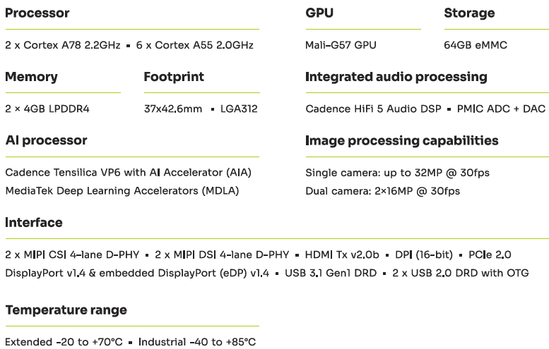 The GenioSOM-700 features the MediaTek MT8390 processor, which is an entire processor subsystem presented as a System-on-Chip (SoC). The MediaTek MT8390 is implemented at the 6µm process node, which is very advanced for a processor used in Edge AI for industrial applications and smart home/office/city deployments.