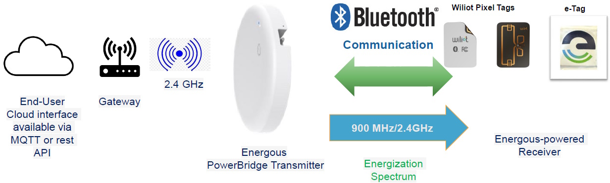 In addition to beaming power to sensors and tags at 900MHz, PowerBridge units also gather data from these devices using Bluetooth communications. This data can be used locally (in a factory, for example) or fed to a gateway device, and from there into the cloud.