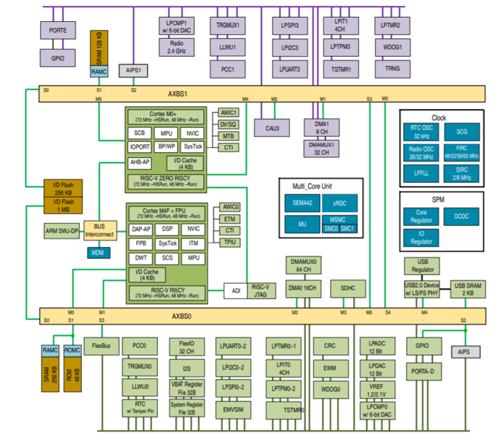 Technically, all four cores can be independently used together, but the cores in each RISC-V/ARM pair share a bus with no arbitration, so that limits everyone running at the same time. Rather than this being a four-core multicore chip, it’s more like a two-core heterogeneous platform, with a choice between RISC-V and ARM for each core. So it would be much more appropriate for comparing apps or comms on one core vs. the other.