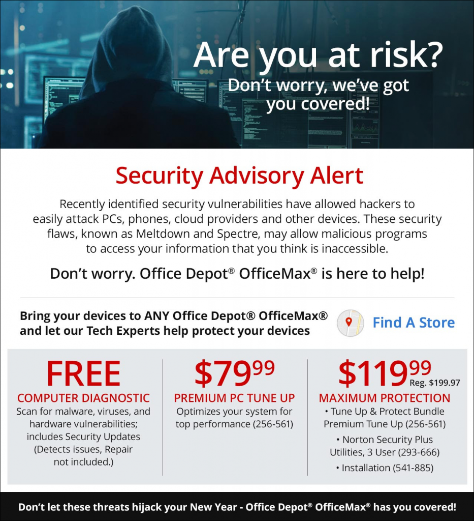 “…These security flaws, known as Meltdown and Spectre, may allow malicious programs to access your information that you think is inaccessible. Don’t worry. Office Depot Office Max is here to help!”