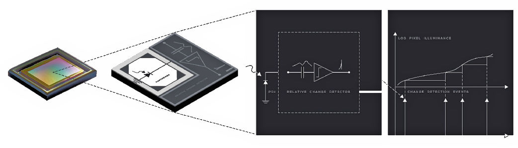 The Prophesee Metavision motion sensor incorporates a photodiode and an ac-coupled threshold detector that generates an output only when light falling on the pixel changes by a set amount. Image credit: Prophesee