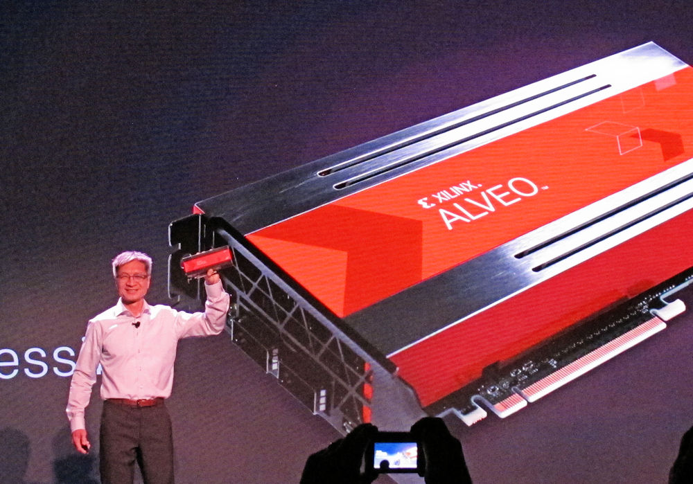 Xilinx President and CEO Victor Peng announces the company’s Alveo hardware accelerator for data centers at XDF. (Image Source: Steve Leibson)