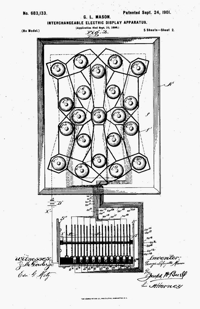 As I understand it, one of the moderators of the group, John Smout, ran across this patent for a 21-segment display that was filed by George Lafayette Mason in 1898, which is 123 years ago as I pen these words. The original displays employed 21 small incandescent bulbs — one per segment — which were controlled by a complicated electromechanical switch that activated groups of segments as required to represent the different characters.