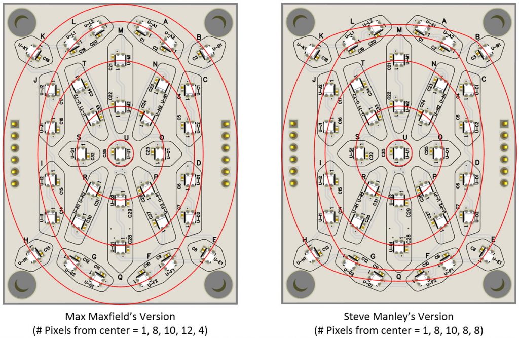 With regard to the circuit board shown earlier, did you spot the fact that some of the segments boast two tricolor LEDs? Well, this made me think that we could visualize the LEDs as forming rings and use these rings to display ripples of light radiating from, or converging on, the center. Such an effect could find multiple uses, including transitioning from one phrase to another. After I sketched this out, I talked to Steve, but it turned out he was ahead of me. On the other hand, we soon discovered that we had come up with slightly different implementations as shown below.