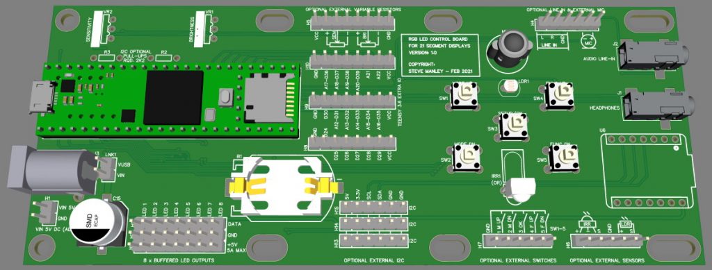There’s far too much to go into here. Suffice it to say that this control board is designed to mount on the back of the display spanning three character “slots.” It will accept either a Teensy 3.2 or 3.6. It boasts a real-time clock and back-up battery, and one can optionally add an audio codec chip for sound, along with a Seeeduino XIAO processor to handle communications from an infrared controller (the location for the XIAO is on the right-hand edge of the board).