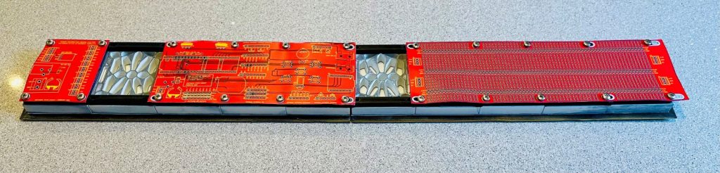 The image below shows mockups of the three boards printed on card and attached to the back of one of Steve’s early displays. From left to right we see the power distribution board (occupying one “slot”), the main control board (three “slots”), and the prototyping board (four “slots”). The reason I say “early displays” is that this image shows ten of the original 3D printed shells, which are the ones I have. Steve subsequently created new shells for his latest display. These updated shells are a little wider, thereby providing a slightly larger gap between characters, which Steve deems to be aesthetically more pleasing. This also explains why some of the attachment holes on the boards are presented as elongated slots, thereby allowing the boards to be attached to displays created using Steve’s new shells and my older versions.