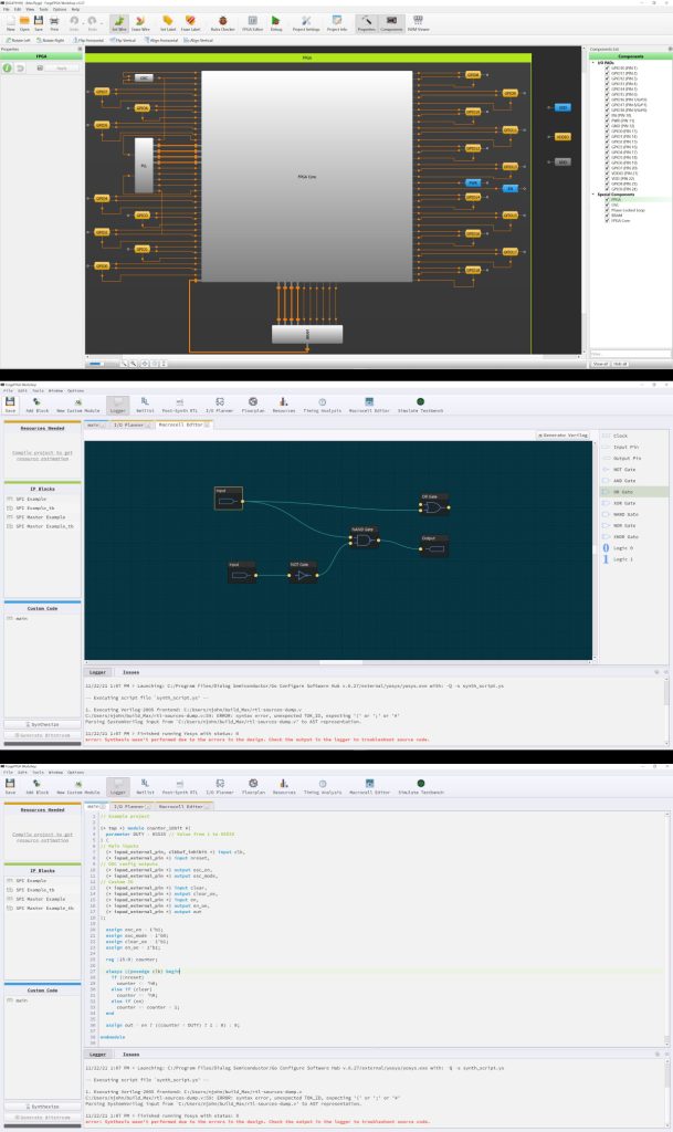 ForgeFPGA Workshop; Default view (top), Macrocell mode (middle),