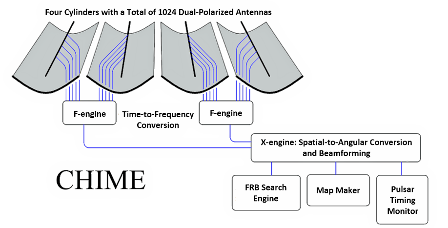 Figure 2. CHIME’s FPGA-based F-engines use FFTs to channelize the frequencies from the telescope’s antenna data. The GPU-based X-engine correlates the F-engine data. The X-engine output feeds several search engines including the FRB engine. (Image source: CHIME)