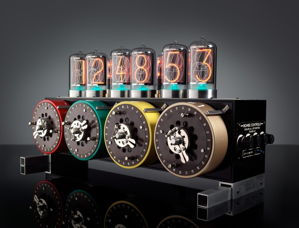 This bodacious beauty was inspired by Alan Turing’s Bombe, which helped British cryptologists decipher German Enigma-machine-encrypted secret messages during World War II. Observe the six Nixie tubes mounted on top of the Bombe. These tubes are about 2” wide and 4” tall, which is reasonably large in the scheme of things (even in their heyday, most Nixie tubes were much smaller; the popular 1N-14, for example, was only around 0.75” wide and 1.5” tall). When a voltage of about 170V is applied to one of the cathodes, that filament is surrounded by an orange glow discharge with an effect that is very pleasing to the eye.