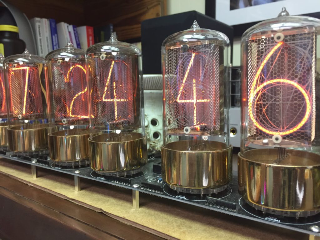 The tubes shown on Paul Parry’s Bombe clock are R|Z568Ms created by Dalibor. I have six of Dalibor’s R|Z568M tubes of my own in my office as shown in the photo below. The electronics (the board under the tubes) were designed and created by my chum Pete, who is the owner of PV Electronics.