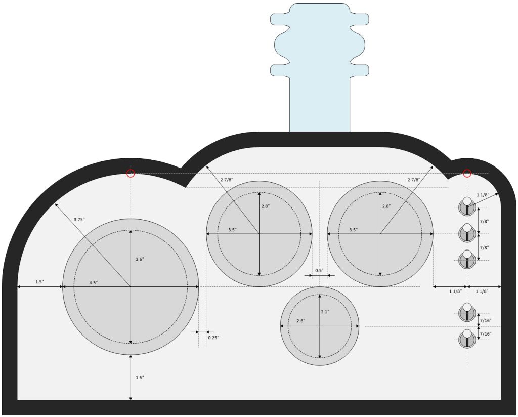 I’m sad to say that I’ve never received any formal training in design, but I do have an innate belief that people notice little things, albeit subconsciously. For example, observe that the bottoms of the two medium-size meters and the top of the small meter are lined up with the centerline of the large meter. Also, that the upper group of three toggle switches is aligned with the centerline of the medium-size meters, while the lower group of two switches is centered on the small meter.