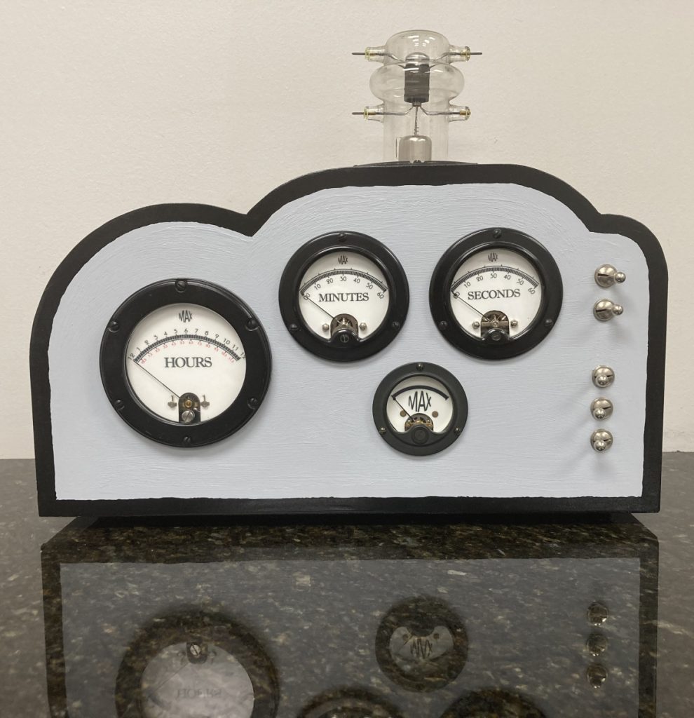 In the case of my own interpretation of this device, I decided to employ four analog meters: a large one for the hours, two medium ones for the minutes and seconds, and a little one to swing back and forth each second like a miniature metronome. You wouldn’t believe how much time I can spend (some may feel the word “waste” is more appropriate) deliberating over things like the layout of a front panel. For example, consider the current state of play with respect to my cunning chronometer.
