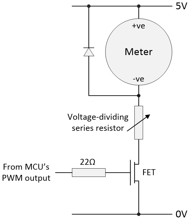 Using a PWM output from an MCU to control an analog meter (the diode is included to protect against back-EMF)
