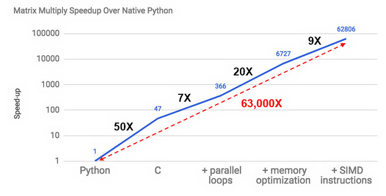 There’s a tremendous opportunity to speed the execution of domain-specific applications that exploit the targeted domain’s unique opportunities for parallelism and tailored data structures. Patterson projected this chart as proof that there’s a factor of 63,000x potential performance improvement for Python code using DSAs and appropriate compilers: