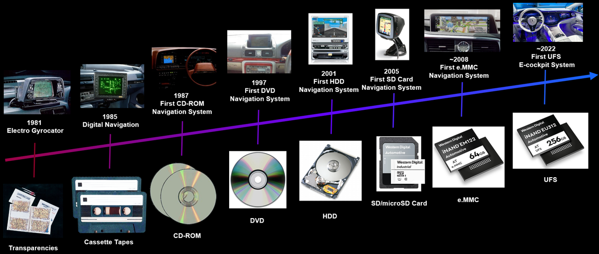 Similarly, I was unaware that digital automotive navigation systems circa 1985 stored their data on cassette tapes. Also, this was my first introduction to next-generation navigation systems based on universal flash storage (UFS).