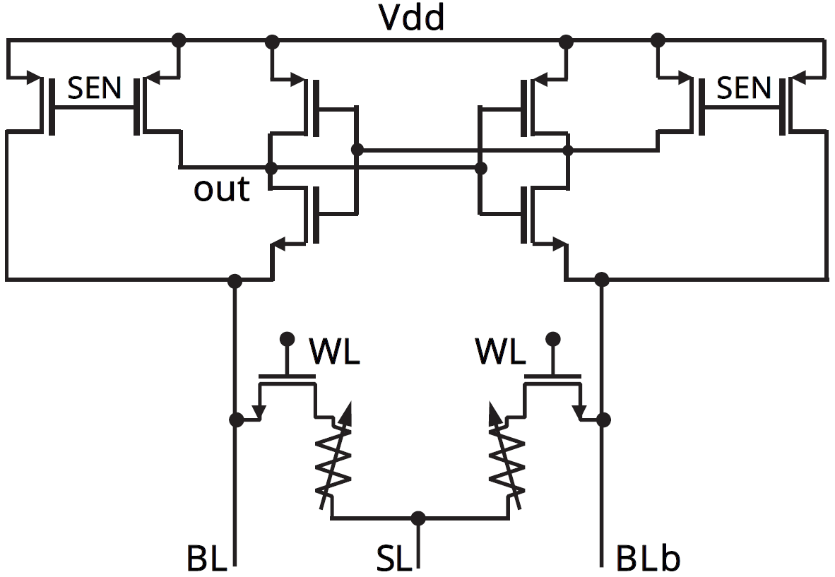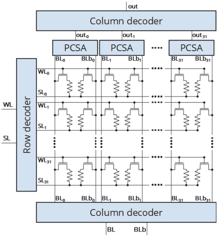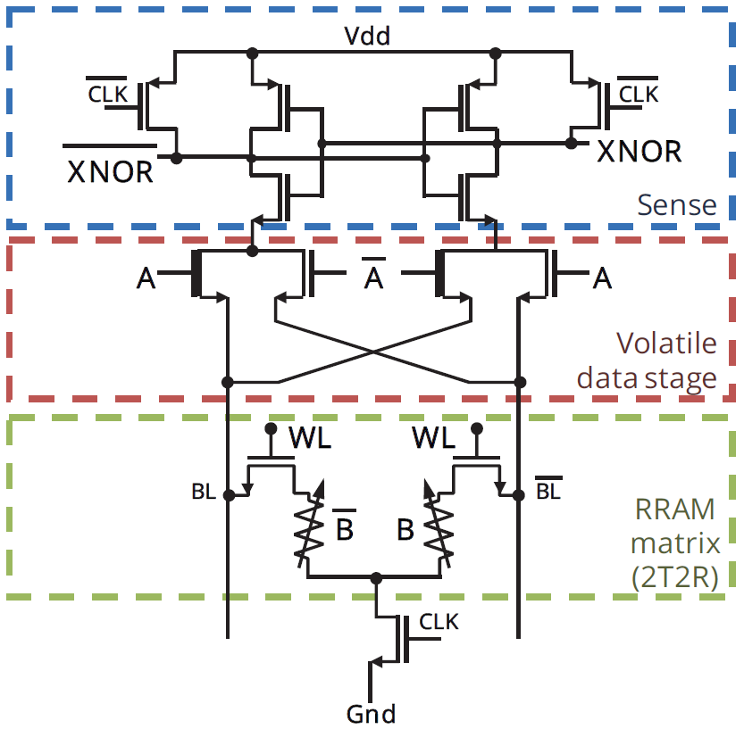 They developed a differential RRAM bit cell. While the more typical version uses one transistor and one resistor for each cell (so-called 1T1R), they used a differential approach, meaning a 2T2R cell. Yeah, you might think that this makes the array larger – and, presumably, it does – but if it means you can get rid of ECC, that could be a good tradeoff. The figure below shows both the cell and the pre-charge sense-amp (PCSA) circuit used to read the memory.