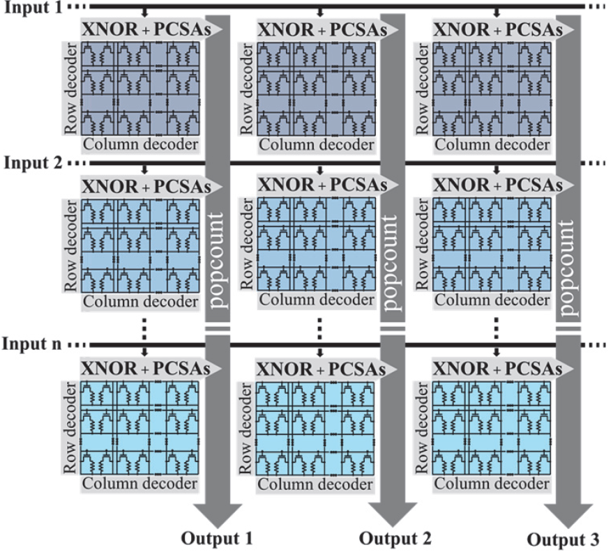 In addition, the XNOR gate can be implemented in the sense amp, meaning that a readout can already include the multiplication result. This is shown in the figure below. Of course, there’s nothing to stop someone from using a separate XNOR gate; it’s still way, way simpler than a multiplier.