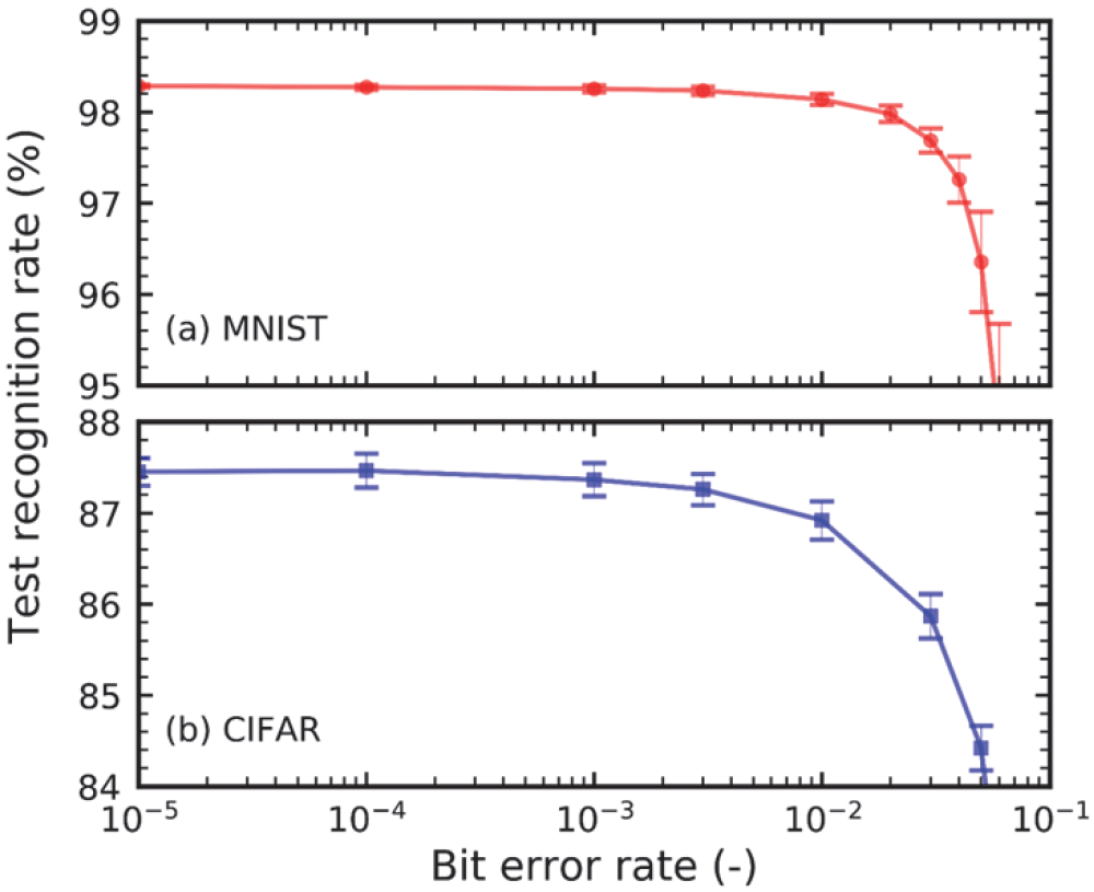 On the first set, they achieved a recognition rate of 98.4%; on the second, they achieved 87%. More interestingly, however, was the fact that this approach appears to be error-tolerant. As they note, with most digital calculations, an error is catastrophic. And yet, they found that they could withstand an error rate up to 2×10-3 without significantly affecting the results. And they determined that endurance would extend into the billions of cycles.