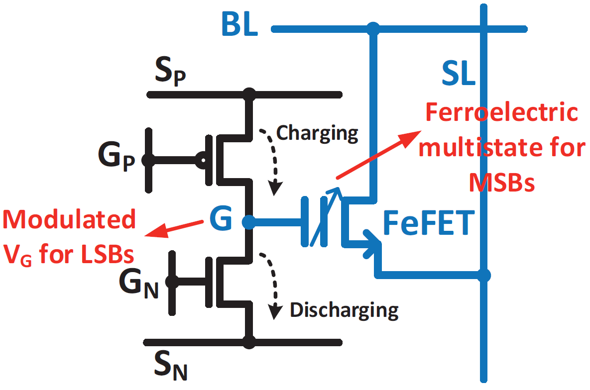 That G node is the key: its value is set by pulses applied on GP to charge it up and on GN to discharge it. During the training phase, these pulses are applied to adjust the value and, in theory, once training is complete, it can be loaded into the FeFET – with lower resolution. But there’s a real-world catch: that G node leaks, and in a matter of a millisecond or so, it can lose the equivalent of a pulse.