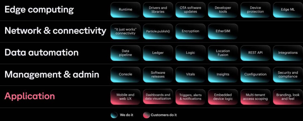 After building on things layer by layer, Particle now offers an entire IoT software stack, starting with edge computing, then network connectivity, then data automation, then management and administration. All users need to do is add their applications.